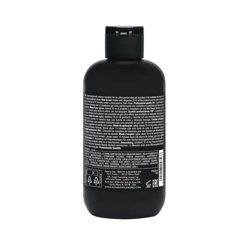 Agitar, quitar el tapón, y dosificar 25 ml de producto apretando delicadamente. Mezclar en un bol con una ampolla Beauty Genesis. Aplicar en el cabello húmedo y distribuir uniformemente en largos y puntas. Dejar actuar 15 minutos bajo una fuente de calor y enjuagar.