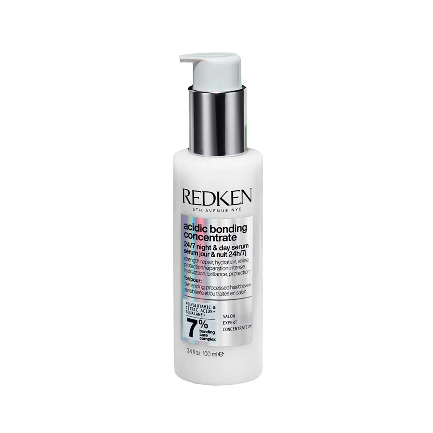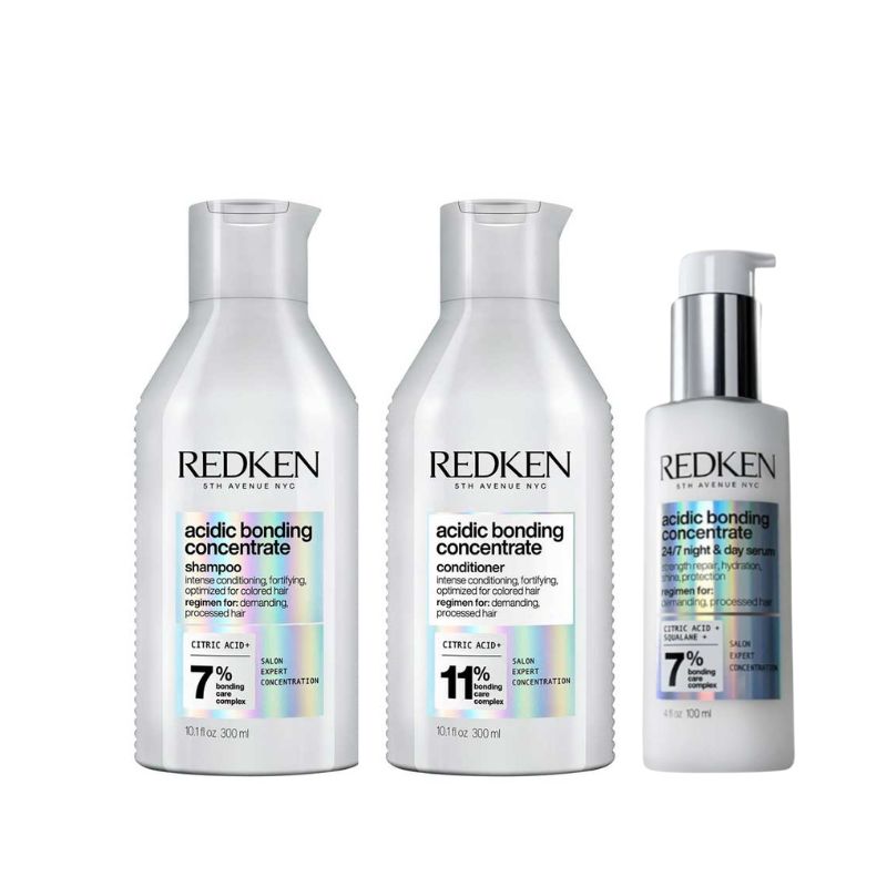 Pack reparación máxima para cabello dañado, decolorado contiene: Shampoo Redken Acidic Bonding Concentrate 300 ml + Acondicionador 300 ml + Serum Redken Acidic Bonding Concentrate 24/7 100ml.