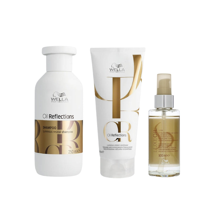 Pack para Cabello Seco Wella Oil Reflections: Shampoo 250 ml + Acondicionador 200 ml + Luxe Oil 100 ml