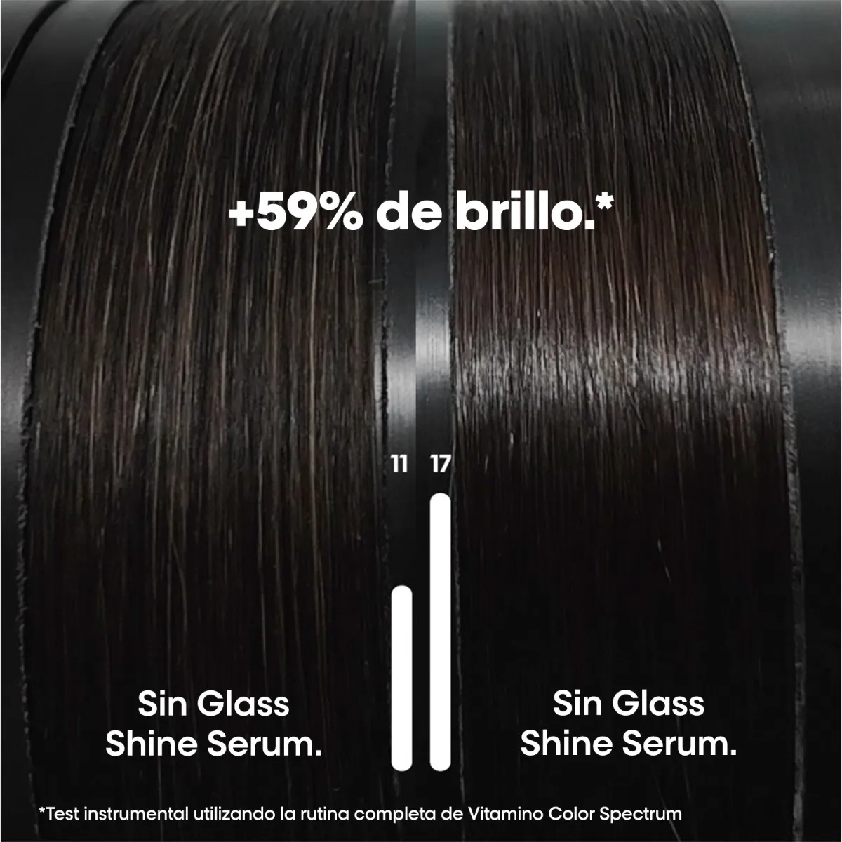 ***Test instrumental después del uso de Shampoo+Acondicionador+sérum.****Prueba instrumental después del sistema completo de Vitamino Color Spectrum después de 4 semanas,. -