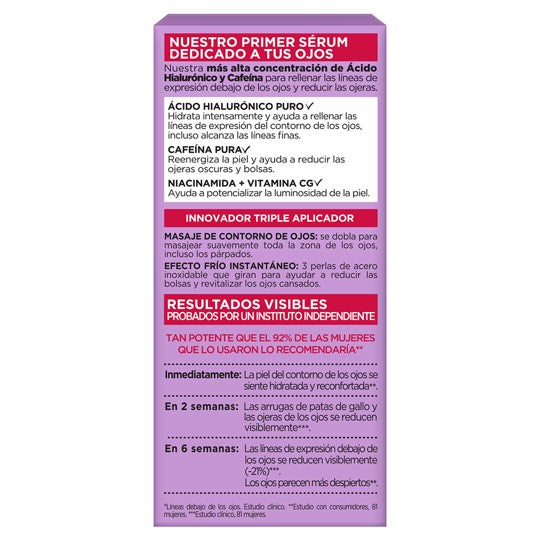 Serum Rellenador Ojos de Revitalift Ácido Hialurónico, nuestro primer sérum dedicado a tus ojos. 1,5 % de ácido hialurónico puro, 1% de suero de ojos con cafeína pura para rellenar, iluminar y reducir visiblemente las arrugas alrededor del ojo.