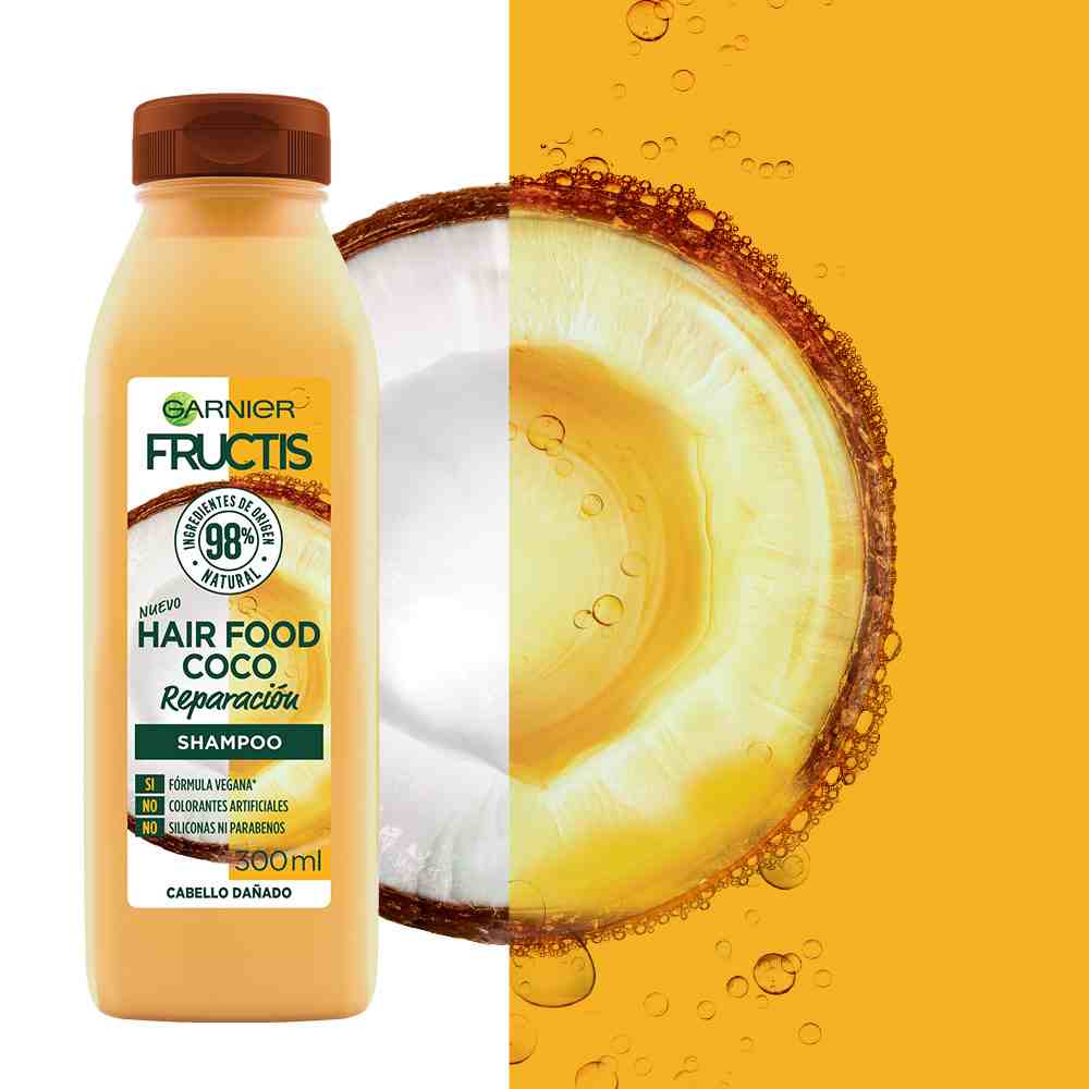 Shampoo Garnier Fructis Hair Food Coco 300ml para reparar intensamente tu pelo. Con fórmula vegana, biodegrable y hecha con ingredientes 97% de origen natural, sin siliconas, parabenos, ni colorantes artificiales. Todos nuestros productos son Cruelty Free. Aprieta, lava y enjuaga con abundante agua; continúa con el acondicionador y consiéntete en la semana utilizando la mascarilla Hair Food.